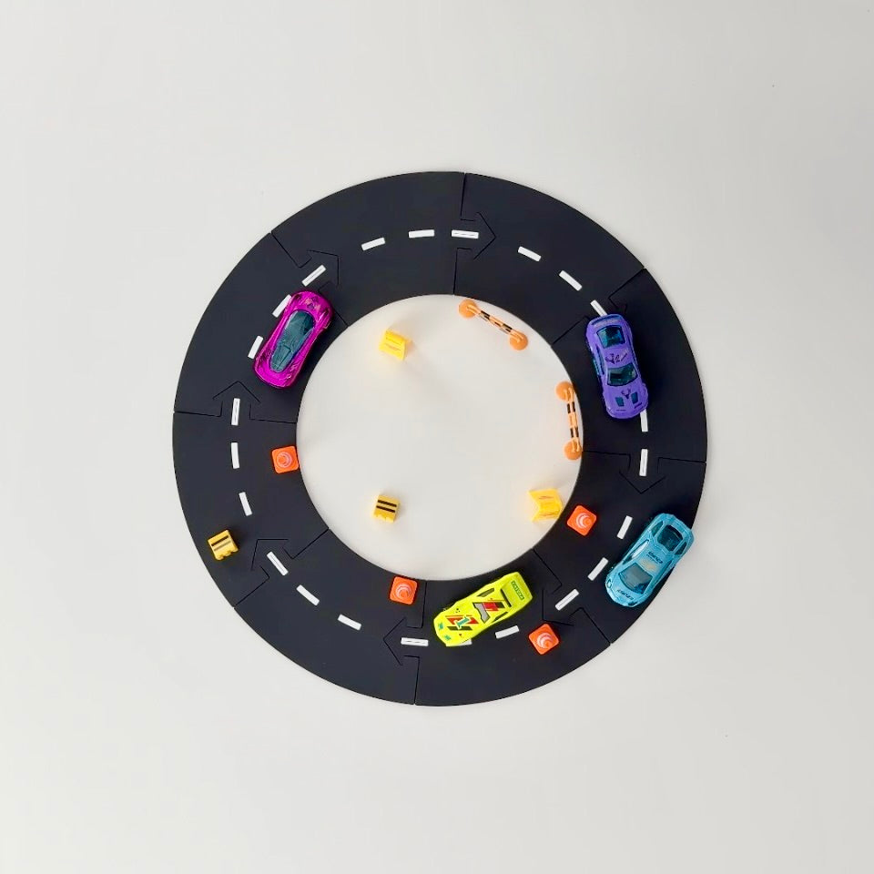 A removable, cleanable bright blue insert, interlocking racetrack pieces (enough to build a full loop), 4 racing cars, track accessories (2 fences, 2 barriers, 4 cones and 2 parking signs).
