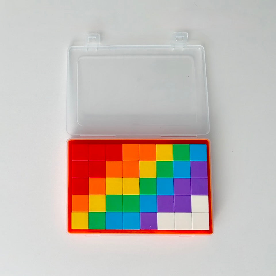 A removable, cleanable bright orange insert, 40 multi-coloured magnetic cubes (6 each of red, orange, yellow, blue, green and purple, and 4 white).