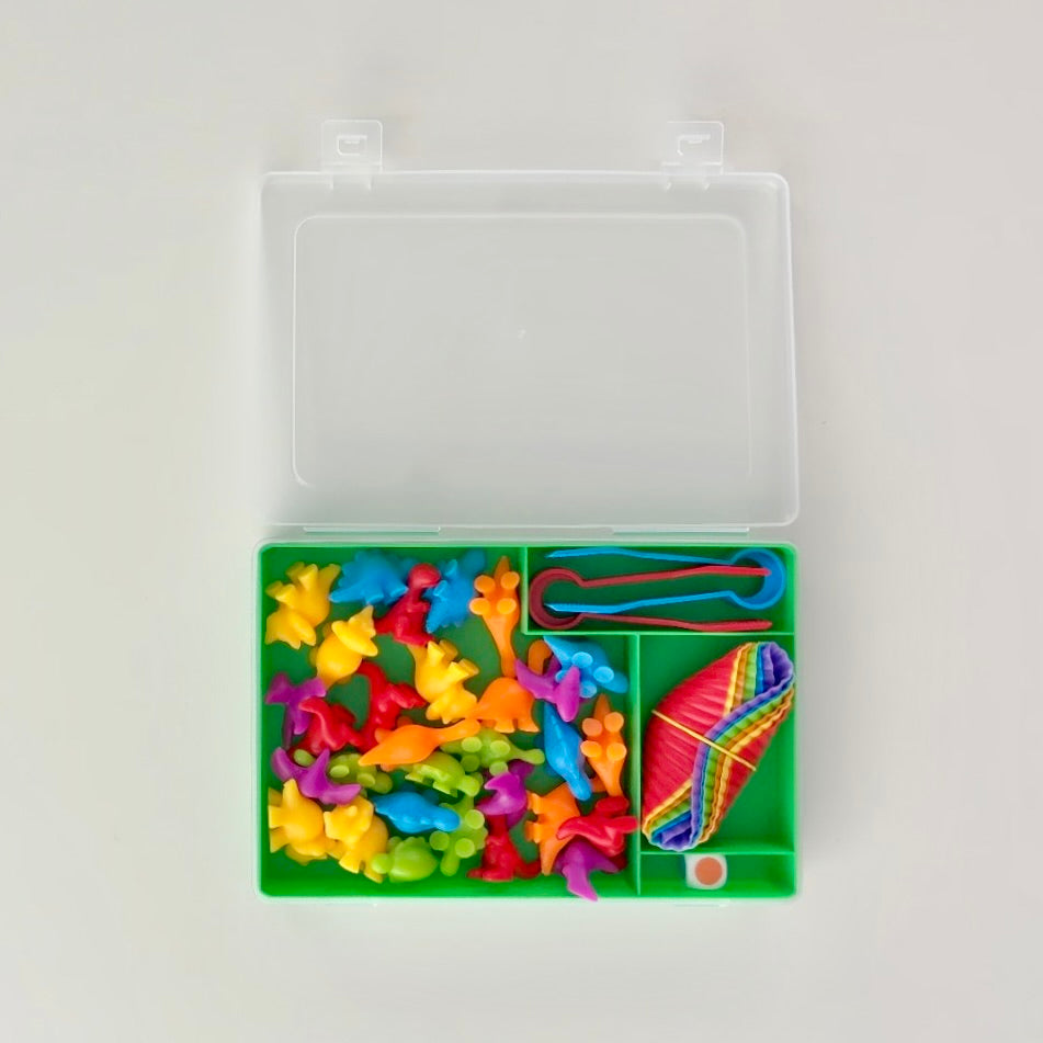 A removable, cleanable bright green insert, 30 coloured animals, vehicles, dinosaurs or koalas (divided equally into 6 colours), 6 colour-matched silicone cups, 1 colour dice and 2 child-friendly tongs.