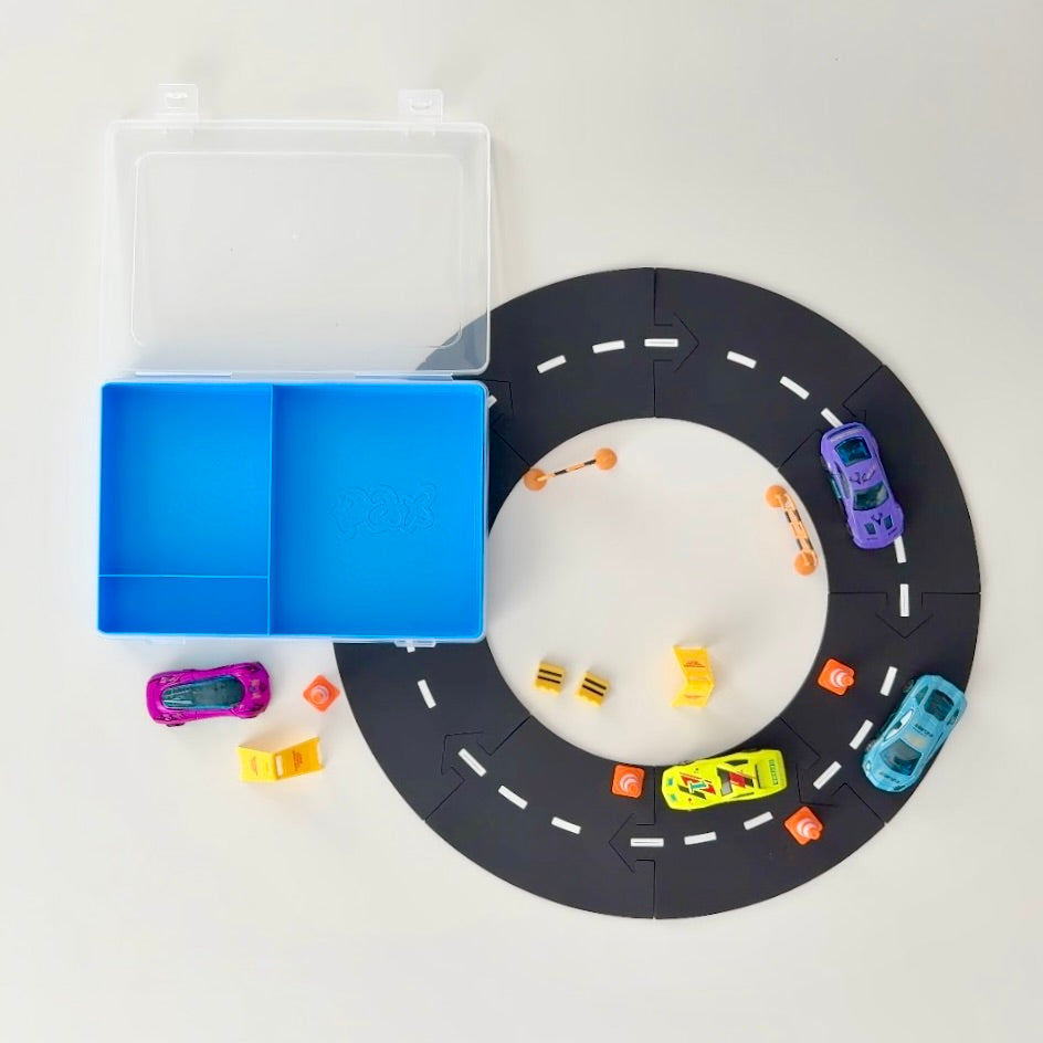 A removable, cleanable bright blue insert, interlocking racetrack pieces (enough to build a full loop), 4 racing cars, track accessories (2 fences, 2 barriers, 4 cones and 2 parking signs).