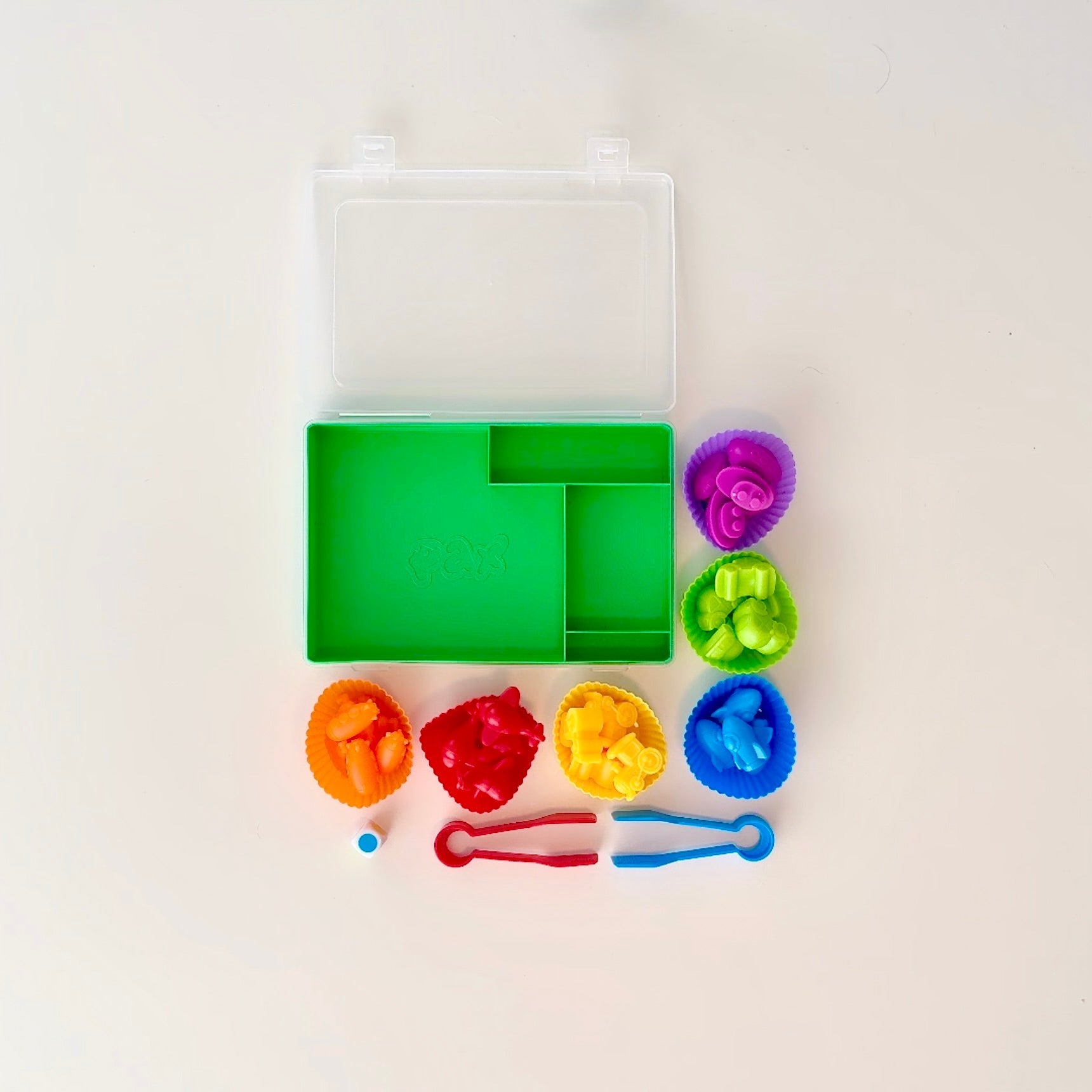 A removable, cleanable bright green insert, 30 coloured animals, vehicles, dinosaurs or koalas (divided equally into 6 colours), 6 colour-matched silicone cups, 1 colour dice and 2 child-friendly tongs.